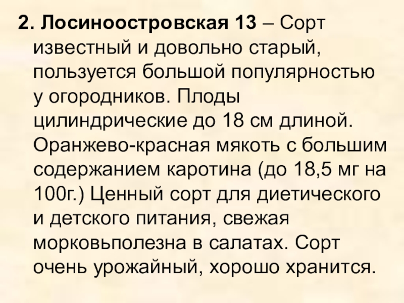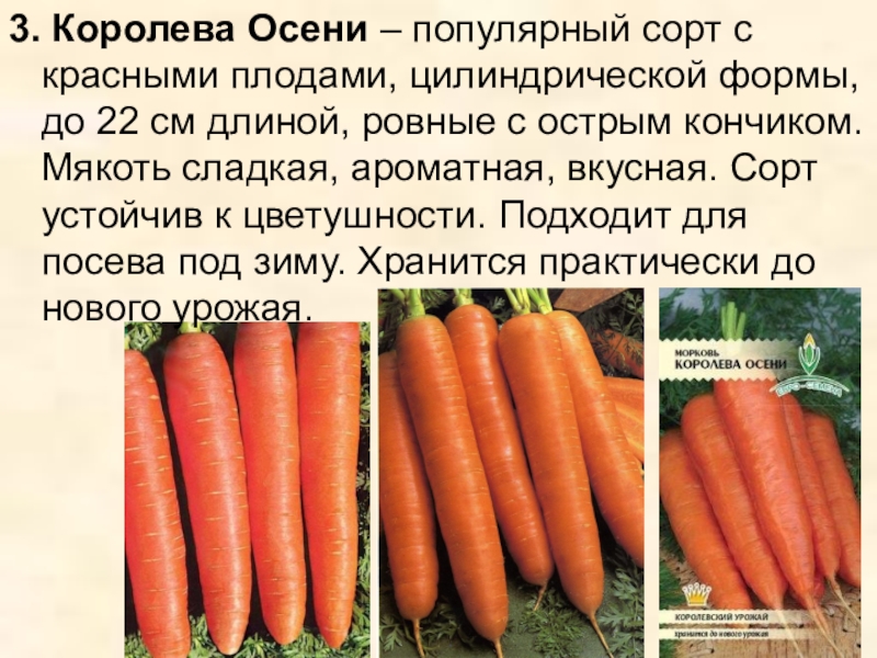у огородников. Плоды цилиндрические до 18 см длиной. Оранжево-красная мякоть с большим содержанием каротина (до 18,5 мг на 100г.) Ценный сорт для диетического и детского питания, свежая морковьполезна в салатах. Сорт очень урожайный, хорошо хранится.