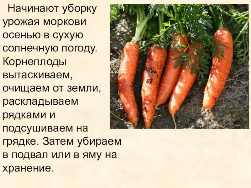 Слайд 5Начинают уборку урожая моркови осенью в сухую солнечную погоду. Корнеплоды вытаскиваем,