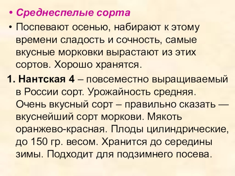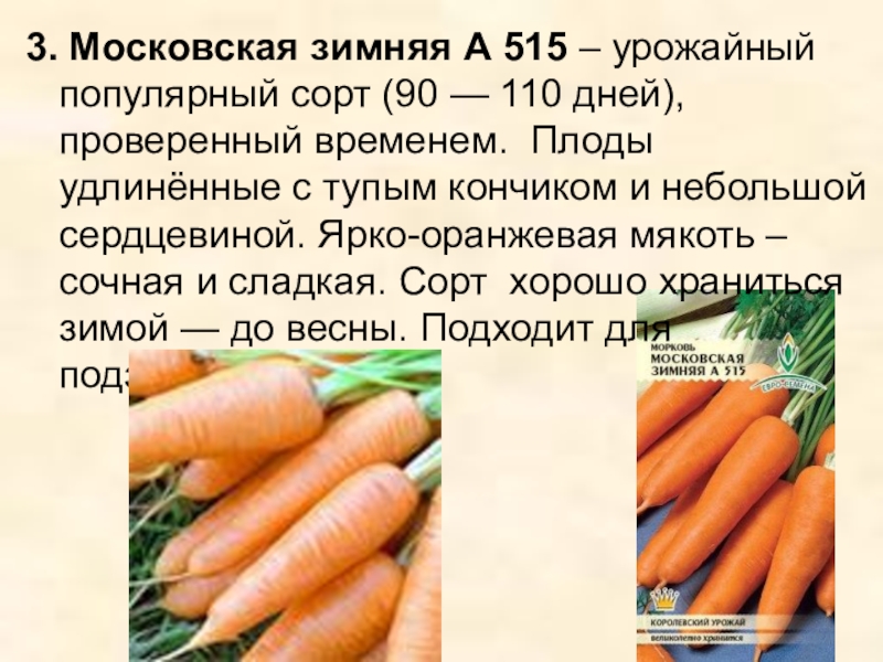 дней), проверенный временем. Плоды удлинённые с тупым кончиком и небольшой сердцевиной. Ярко-оранжевая мякоть – сочная и сладкая. Сорт хорошо храниться зимой — до весны. Подходит для подзимнего посева.