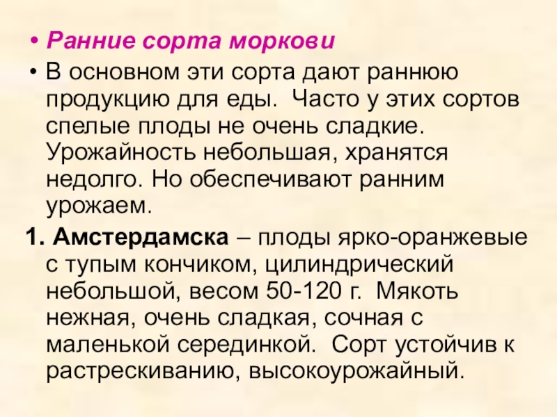 1. Амстердамска – плоды ярко-оранжевые с тупым кончиком, цилиндрический небольшой, весом 50-120 г. Мякоть нежная, очень сладкая, сочная с маленькой серединкой. Сорт устойчив к растрескиванию, высокоурожайный.