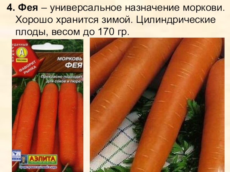 4. Фея – универсальное назначение моркови. Хорошо хранится зимой. Цилиндрические плоды, весом
