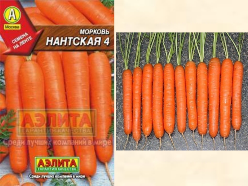 1. Нантская 4 – повсеместно выращиваемый в России сорт. Урожайность средняя. Очень вкусный сорт – правильно сказать — вкуснейший сорт моркови. Мякоть оранжево-красная. Плоды цилиндрические, до 150 гр. весом. Хранится до середины зимы. Подходит для подзимнего посева.