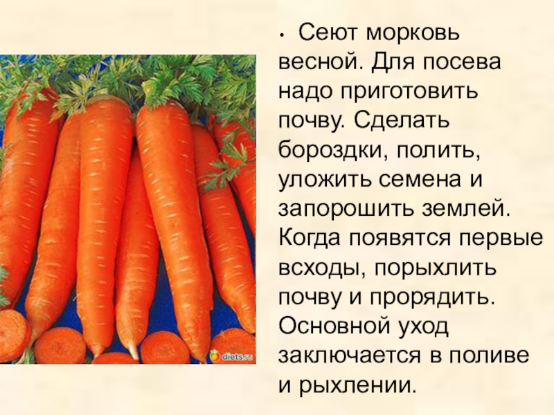 Слайд 4 Сеют морковь весной. Для посева надо приготовить почву. Сделать бороздки,