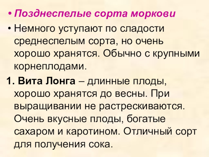 1. Вита Лонга – длинные плоды, хорошо хранятся до весны. При выращивании не растрескиваются. Очень вкусные плоды, богатые сахаром и каротином. Отличный сорт для получения сока.