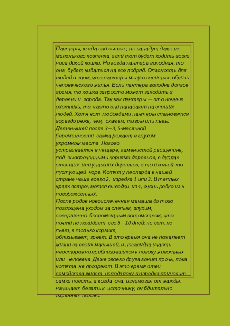 тот будет ходить возле носа дикой кошки. Но когда пантера голодная, то она будет кидаться на все подряд. Опасность для людей в том, что пантеры могут селиться вблизи человеческого жилья. Если пантера голодна долгое время, то кошка запросто может заходить в деревни и города. Так как пантеры — это ночные охотники, то часто они нападают на спящих людей. Хотя вот людоедами пантеры становятся гораздо реже, чем, скажем, тигры или львы.