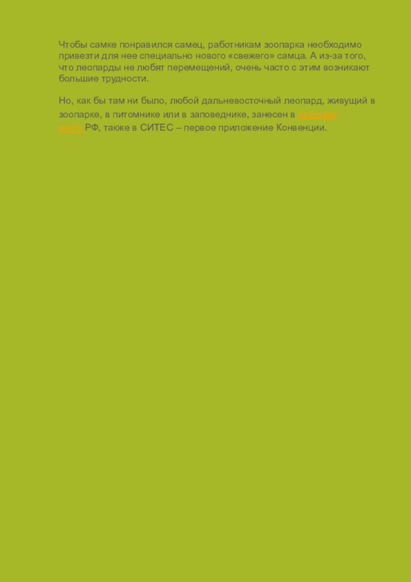 Но, как бы там ни было, любой дальневосточный леопард, живущий в зоопарке, в питомнике или в заповеднике, занесен в Красную