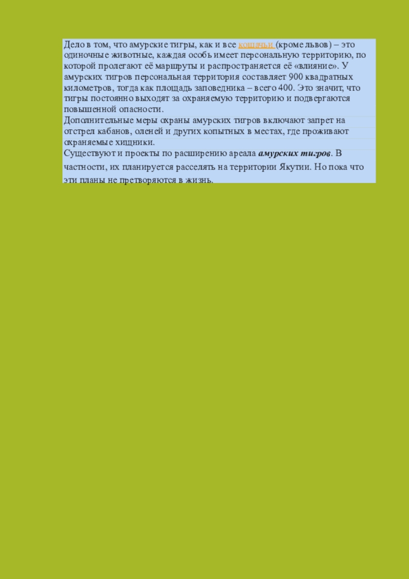 львов) – это одиночные животные, каждая особь имеет персональную территорию, по которой пролегают её маршруты и распространяется её «влияние». У амурских тигров персональная территория составляет 900 квадратных километров, тогда как площадь заповедника – всего 400. Это значит, что тигры постоянно выходят за охраняемую территорию и подвергаются повышенной опасности.