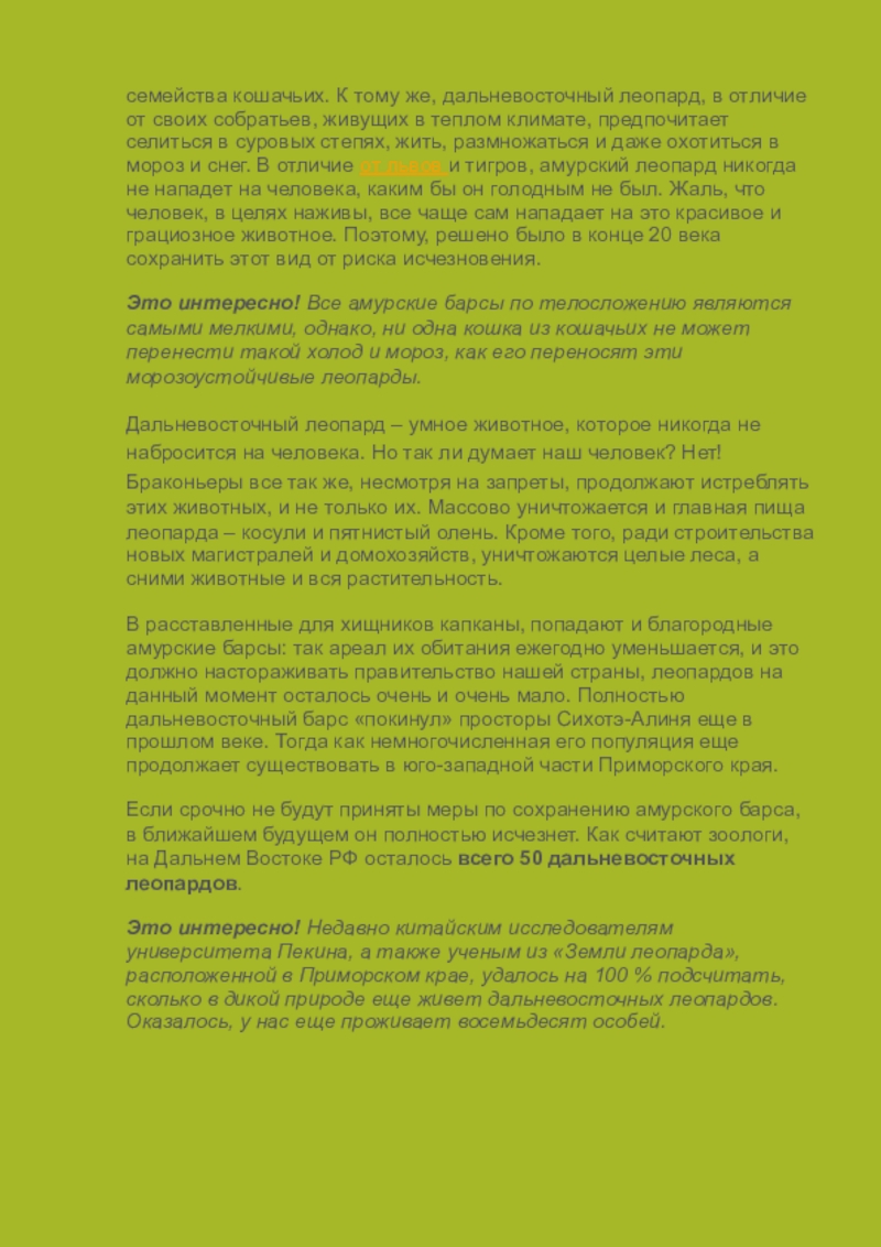 «героями» выступают дальневосточные леопарды, считают, что все они бегают по африканским саваннам. Но, на самом деле именно этот подвид живет только на Дальнем Востоке нашей стране, и этих животных там осталось, к превеликому сожалению, меньшинство.
