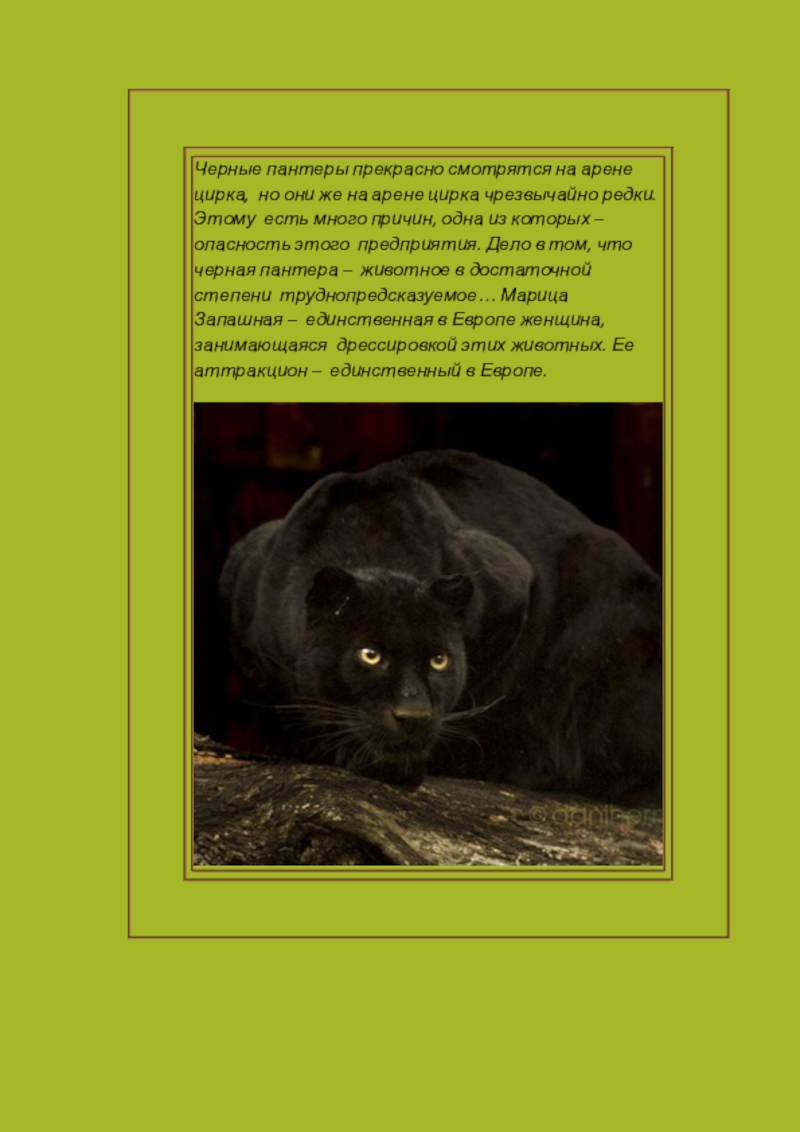 арене цирка чрезвычайно редки. Этому есть много причин, одна из которых – опасность этого предприятия. Дело в том, что черная пантера – животное в достаточной степени труднопредсказуемое… Марица Запашная – единственная в Европе женщина, занимающаяся дрессировкой этих животных. Ее аттракцион – единственный в Европе.