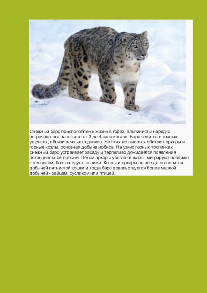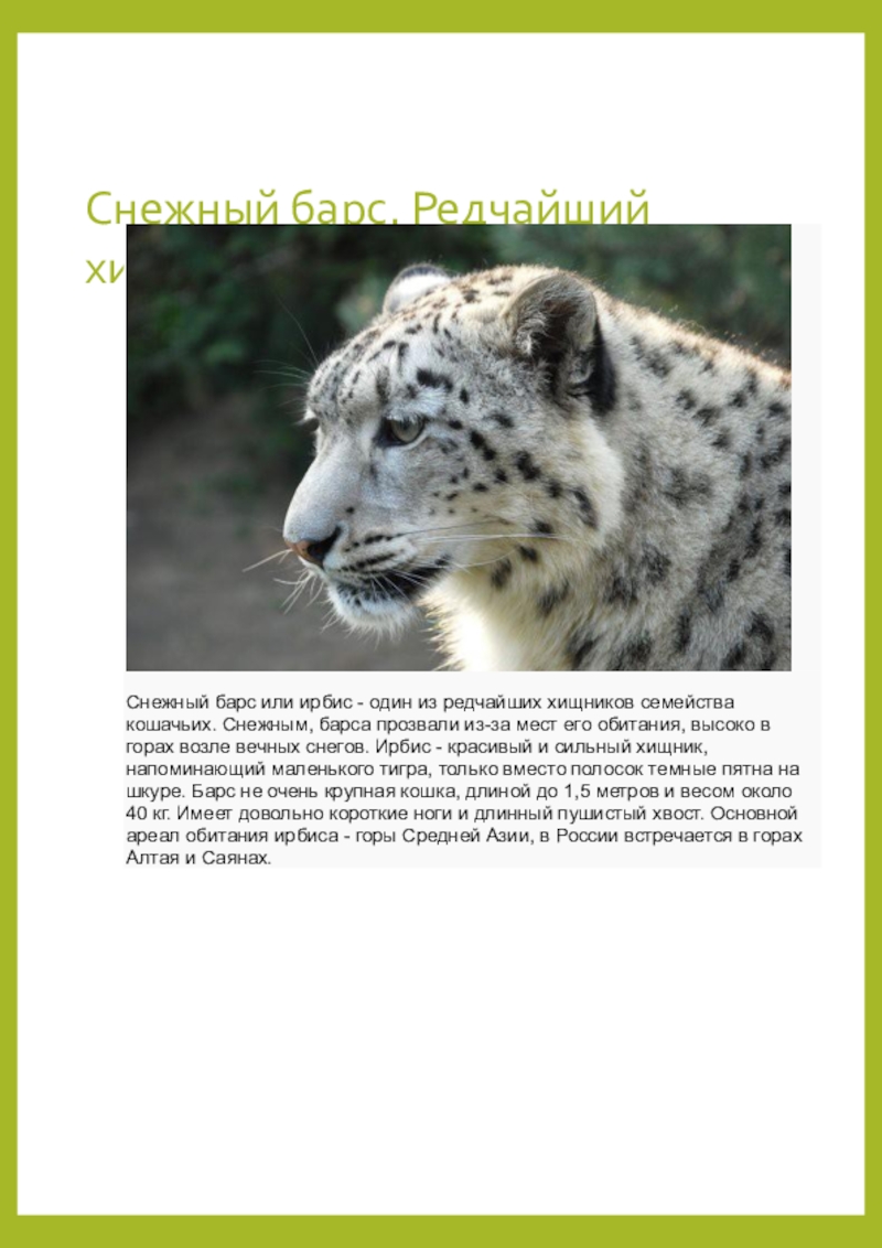 редчайших хищников семейства кошачьих. Снежным, барса прозвали из-за мест его обитания, высоко в горах возле вечных снегов. Ирбис - красивый и сильный хищник, напоминающий маленького тигра, только вместо полосок темные пятна на шкуре. Барс не очень крупная кошка, длиной до 1,5 метров и весом около 40 кг. Имеет довольно короткие ноги и длинный пушистый хвост. Основной ареал обитания ирбиса - горы Средней Азии, в России встречается в горах Алтая и Саянах.