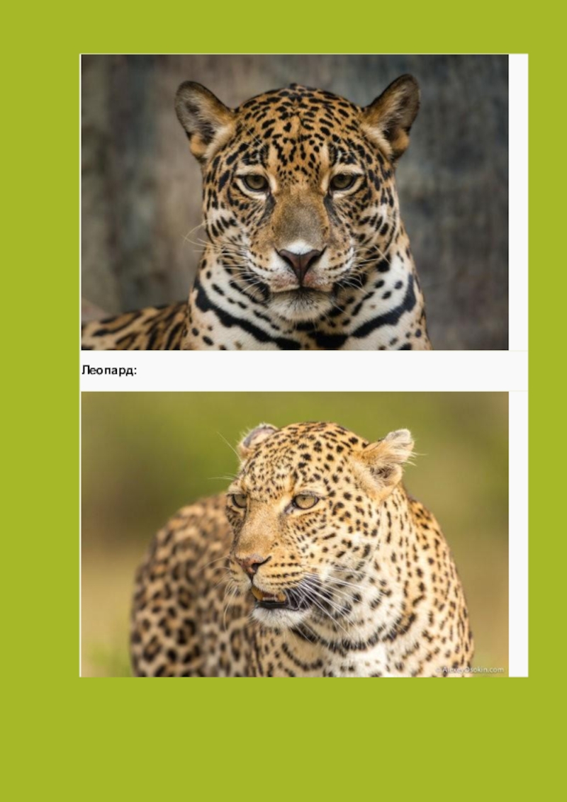 Ягуар и леопард - очень близкие родственники. Как минимум, они представители одно рода семейства кошачьих - пантер. Но если другие представители рода пантер - львы и тигры - имеют очень индивидуальную внешность, то ягуар с леопардом действительно очень похожи. Хотя, если один раз разобраться в этом вопросе, то больше вы их никогда не перепутаете, ведь на самом деле они очень разные.