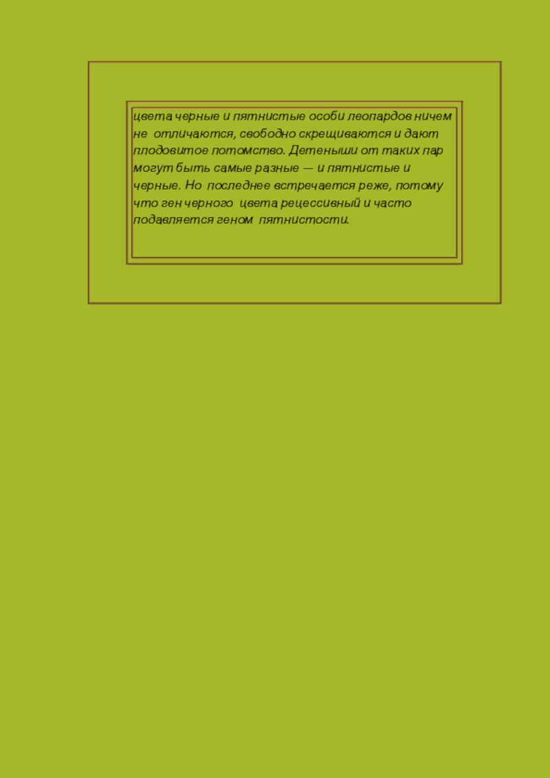 плодовитое потомство. Детеныши от таких пар могут быть самые разные — и пятнистые и черные. Но последнее встречается реже, потому что ген чёрного цвета рецессивный и часто подавляется геном пятнистости.
