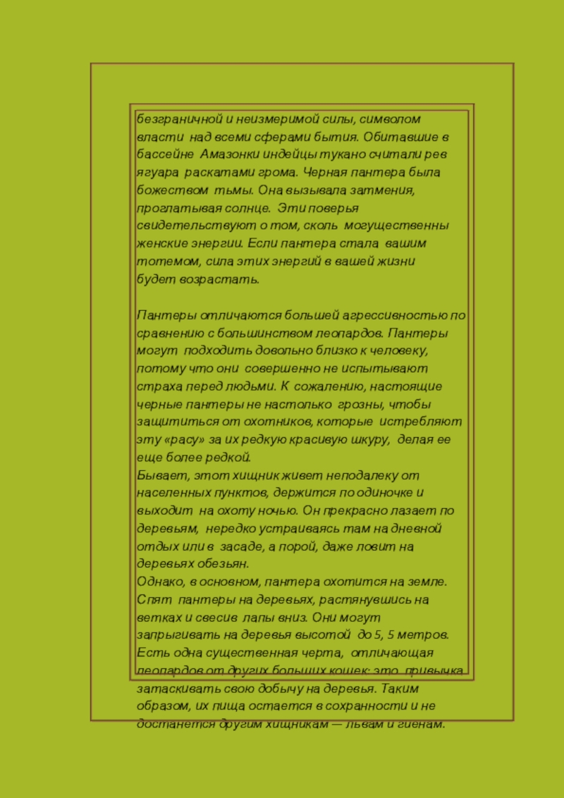 в бассейне Амазонки индейцы тукано считали рев ягуара раскатами грома. Черная пантера была божеством тьмы. Она вызывала затмения, проглатывая солнце. Эти поверья свидетельствуют о том, сколь могущественны женские энергии. Если пантера стала вашим тотемом, сила этих энергий в вашей жизни будет возрастать.