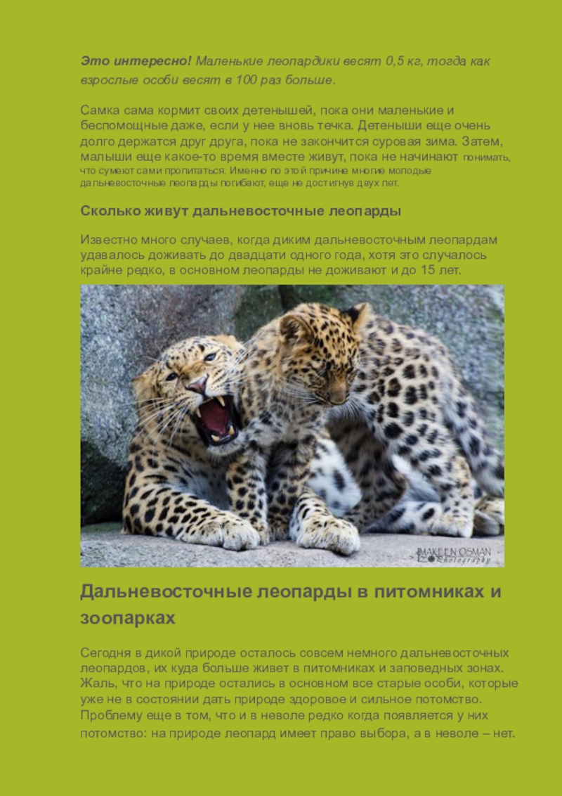 Проблему еще в том, что и в неволе редко когда появляется у них потомство: на природе леопард имеет право выбора, а в неволе – нет.