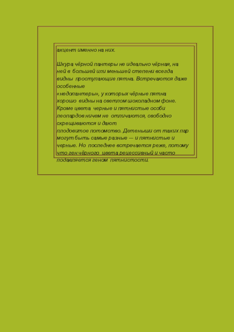 «недопантеры», у которых чёрные пятна хорошо видны на светлом шоколадном фоне. Кроме цвета черные и пятнистые особи леопардов ничем не отличаются, свободно скрещиваются и дают