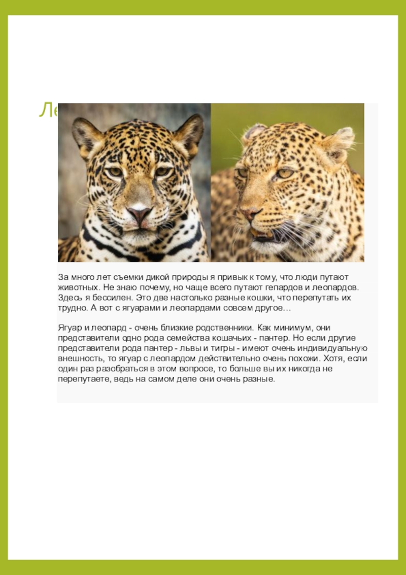 привык к тому, что люди путают животных. Не знаю почему, но чаще всего путают гепардов и леопардов. Здесь я бессилен. Это две настолько разные кошки, что перепутать их трудно. А вот с ягуарами и леопардами совсем другое…