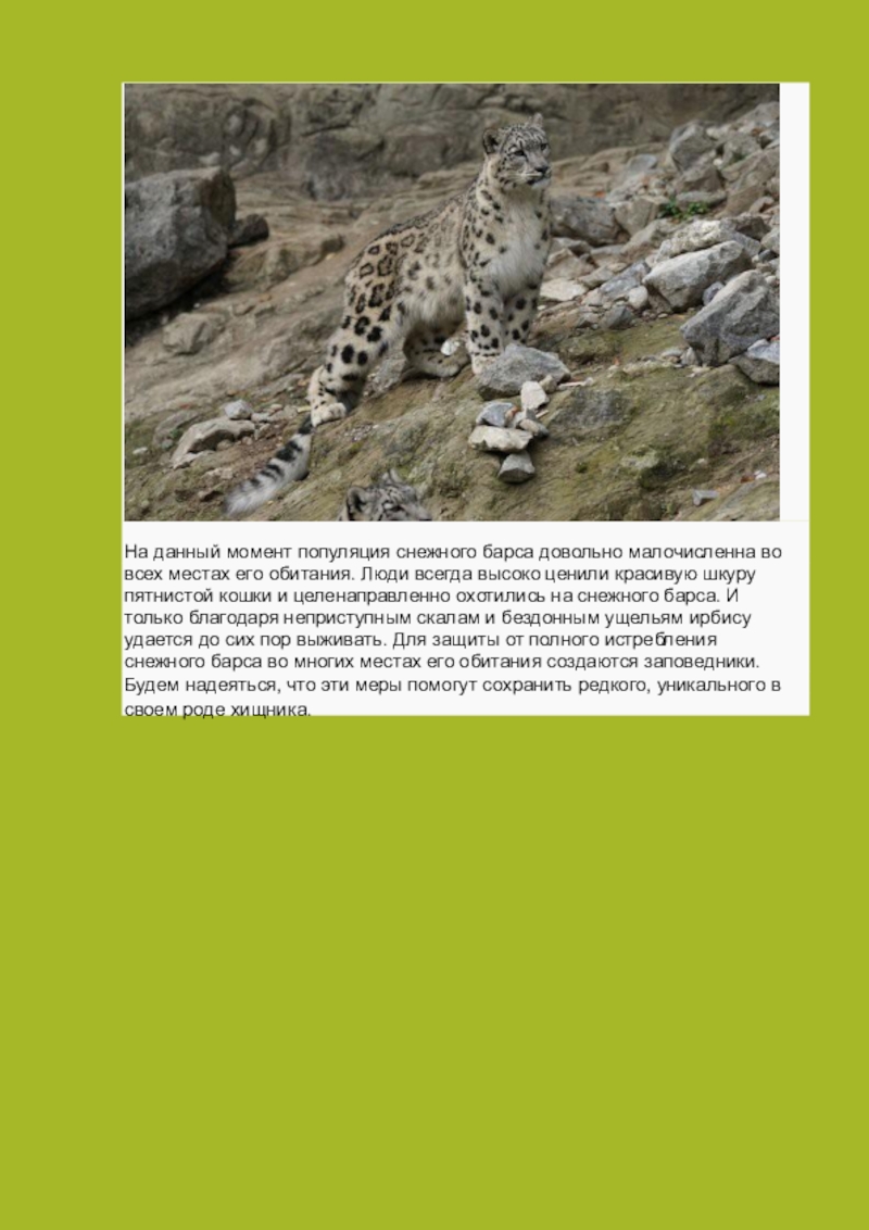 его обитания. Люди всегда высоко ценили красивую шкуру пятнистой кошки и целенаправленно охотились на снежного барса. И только благодаря неприступным скалам и бездонным ущельям ирбису удается до сих пор выживать. Для защиты от полного истребления снежного барса во многих местах его обитания создаются заповедники.
