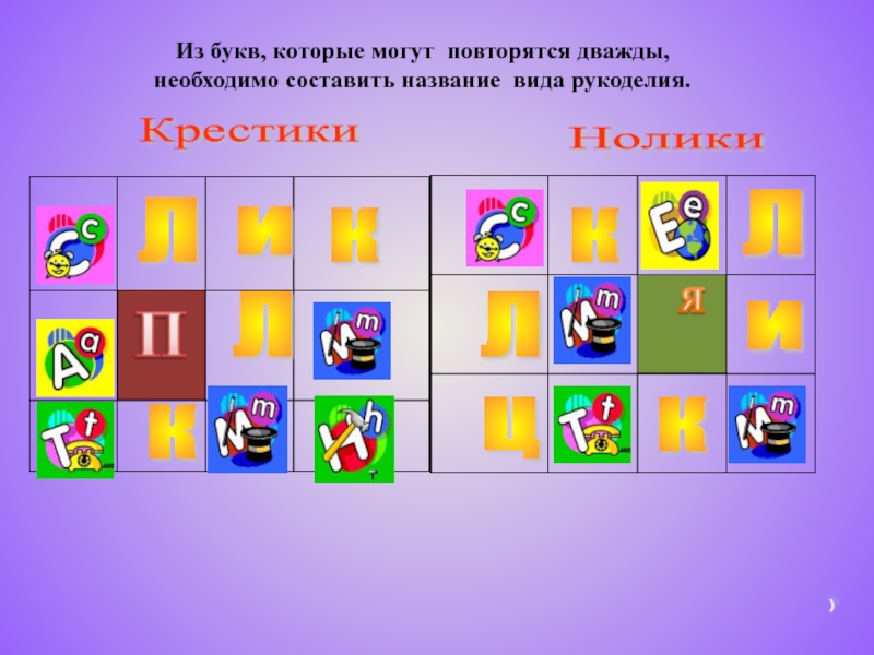 Из букв, которые могут повторятся дважды, необходимо составить название вида рукоделия.