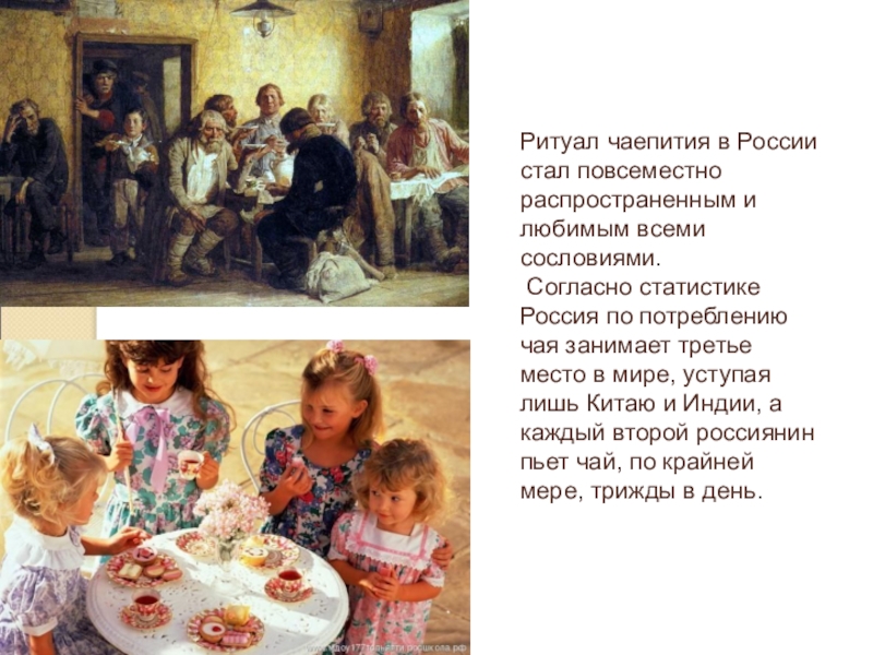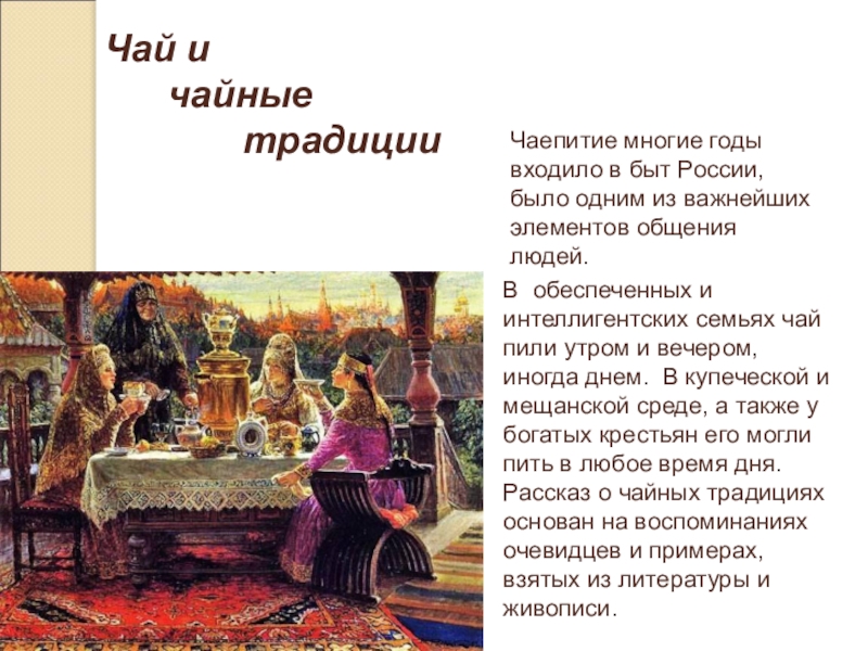 В обеспеченных и интеллигентских семьях чай пили утром и вечером, иногда днем. В купеческой и мещанской среде, а также у богатых крестьян его могли пить в любое время дня.