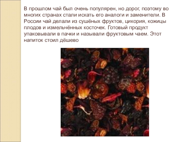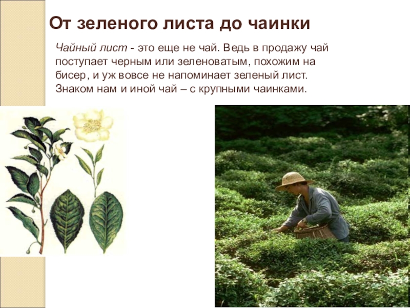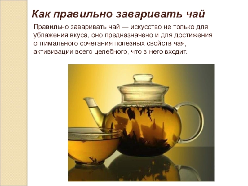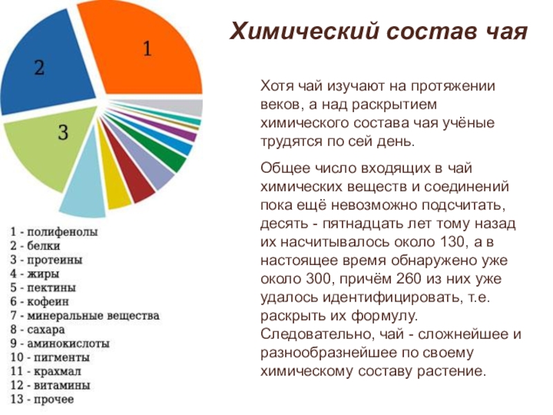 Общее число входящих в чай химических веществ и соединений пока ещё невозможно подсчитать, десять - пятнадцать лет тому назад их насчитывалось около 130, а в настоящее время обнаружено уже около 300, причём 260 из них уже удалось идентифицировать, т.е. раскрыть их формулу. Следовательно, чай - сложнейшее и разнообразнейшее по своему химическому составу растение.