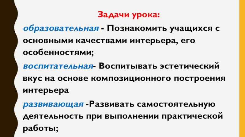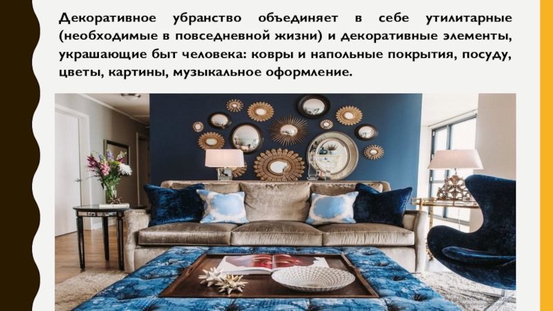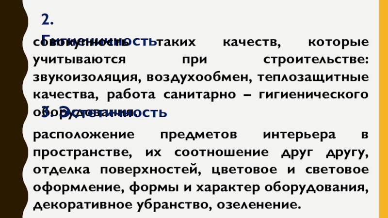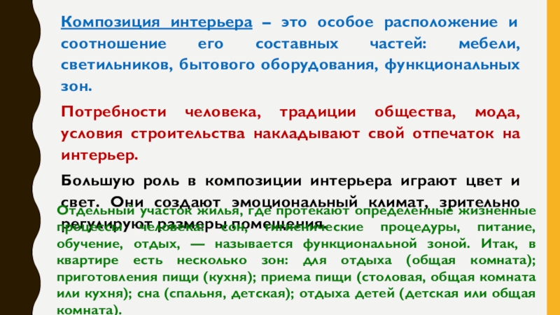 расположение предметов интерьера в пространстве, их соотношение друг другу, отделка поверхностей, цветовое и световое оформление, формы и характер оборудования, декоративное убранство, озеленение.