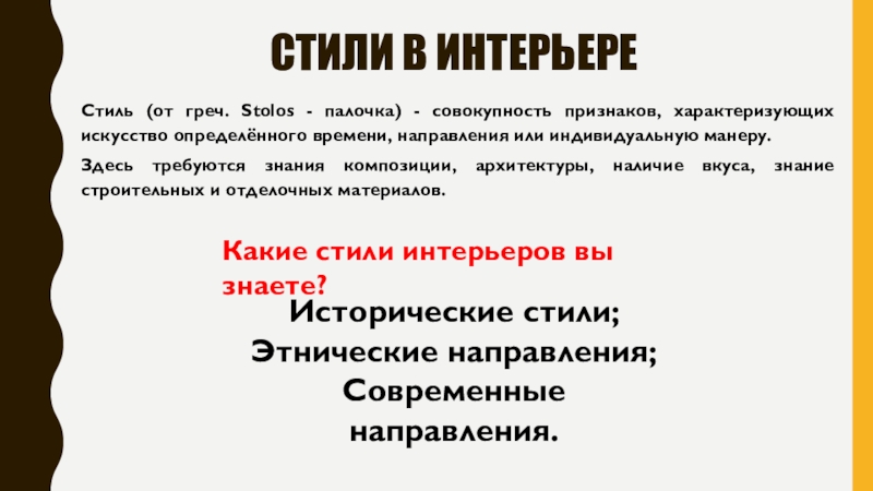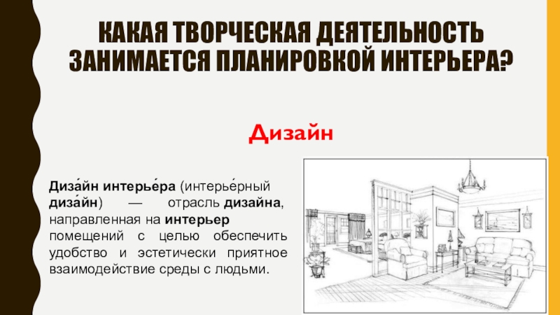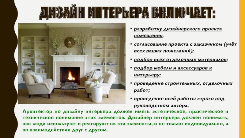Архитектор по дизайну интерьера должен иметь эстетическое, практическое и техническое понимание этих элементов. Дизайнер интерьера должен понимать, как люди используют и реагируют на эти элементы, и не только индивидуально, а во взаимодействии друг с другом.