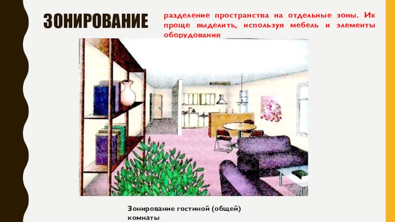 Отдельный участок жилья, где протекают определенные жизненные процессы человека: сон, гигиенические процедуры, питание, обучение, отдых, — называется функциональной зоной. Итак, в квартире есть несколько зон: для отдыха (общая комната); приготовления пищи (кухня); приема пищи (столовая, общая комната или кухня); сна (спальня, детская); отдыха детей (детская или общая комната).