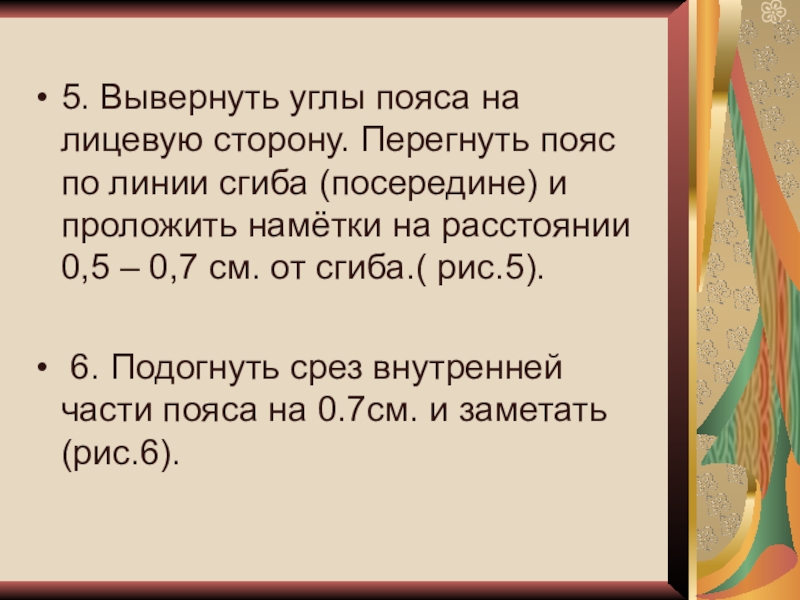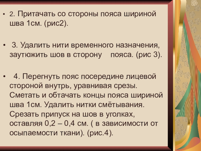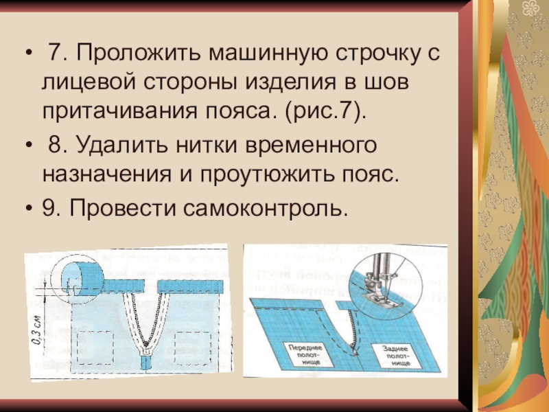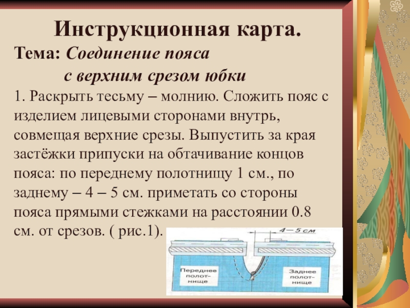 1. Раскрыть тесьму – молнию. Сложить пояс с изделием лицевыми сторонами внутрь, совмещая верхние срезы. Выпустить за края застёжки припуски на обтачивание концов пояса: по переднему полотнищу 1 см., по заднему – 4 – 5 см. приметать со стороны пояса прямыми стежками на расстоянии 0.8 см. от срезов. ( рис.1).
