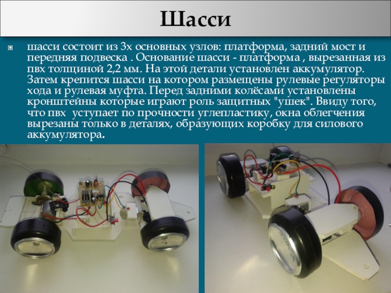 подвеска . Основание шасси - платформа , вырезанная из пвх толщиной 2,2 мм. На этой детали установлен аккумулятор. Затем крепится шасси на котором размещены рулевые регуляторы хода и рулевая муфта. Перед задними колёсами установлены кронштейны которые играют роль защитных "ушек". Ввиду того, что пвх уступает по прочности углепластику, окна облегчения вырезаны только в деталях, образующих коробку для силового аккумулятора.