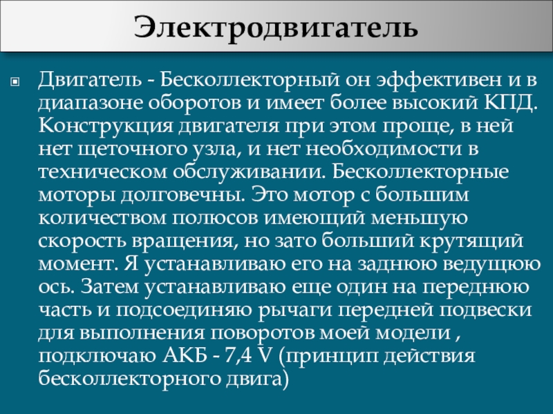 имеет более высокий КПД. Конструкция двигателя при этом проще, в ней нет щеточного узла, и нет необходимости в техническом обслуживании. Бесколлекторные моторы долговечны. Это мотор с большим количеством полюсов имеющий меньшую скорость вращения, но зато больший крутящий момент. Я устанавливаю его на заднюю ведущюю ось. Затем устанавливаю еще один на переднюю часть и подсоединяю рычаги передней подвески для выполнения поворотов моей модели ,подключаю АКБ - 7,4 V (принцип действия бесколлекторного двига)