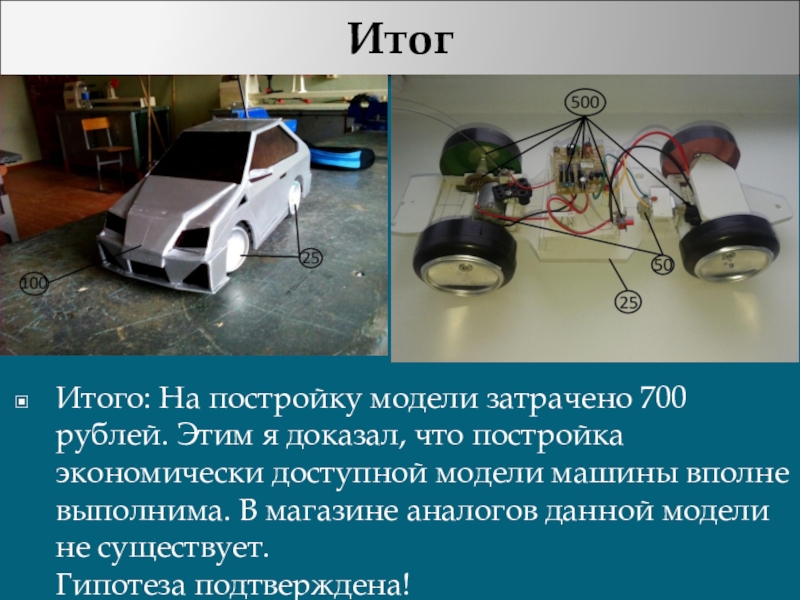 Итого: На постройку модели затрачено 700 рублей. Этим я доказал, что