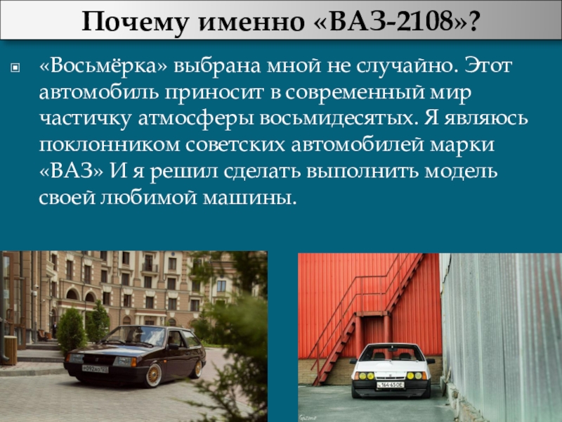 участвовать в конкурсе «Модель своими руками». В ходе моих размышлений «ВАЗ – 2108» стала идеей моего проекта.