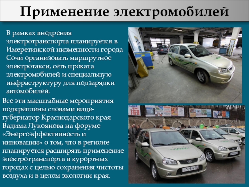 Все эти масштабные мероприятия подкреплены словами вице-губернатор Краснодарского края Вадима Лукоянова на форуме «Энергоэффективность и инновации» о том, что в регионе планируется расширять применение электротранспорта в курортных городах с целью сохранения чистоты воздуха и в целом экологии края.