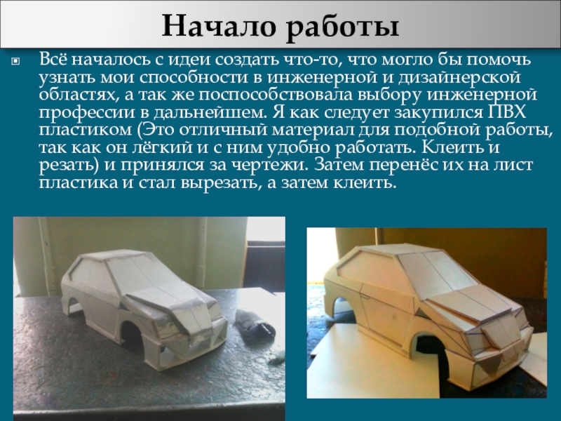 узнать мои способности в инженерной и дизайнерской областях, а так же поспособствовала выбору инженерной профессии в дальнейшем. Я как следует закупился ПВХ пластиком (Это отличный материал для подобной работы, так как он лёгкий и с ним удобно работать. Клеить и резать) и принялся за чертежи. Затем перенёс их на лист пластика и стал вырезать, а затем клеить.