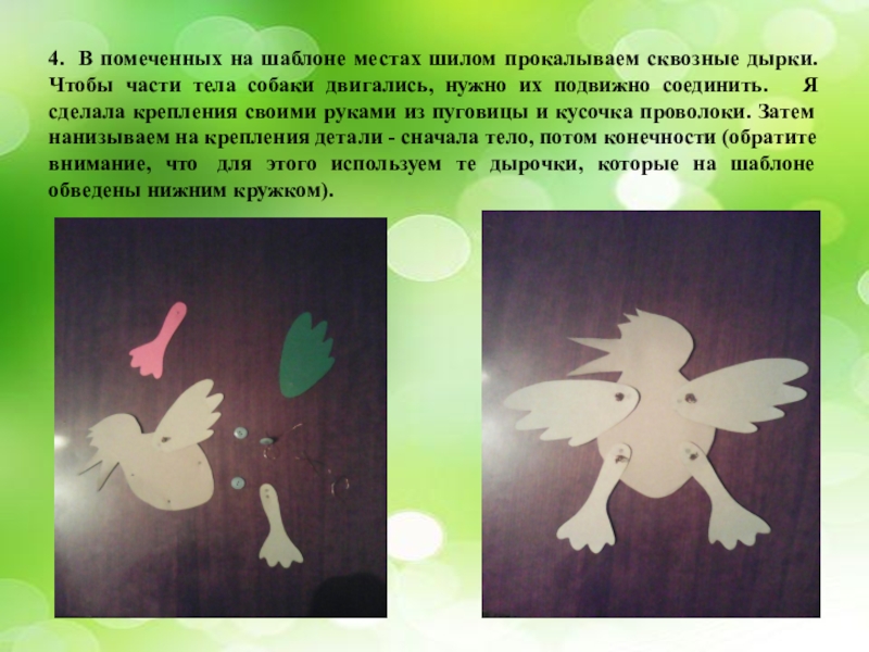 4.  В помеченных на шаблоне местах шилом прокалываем сквозные дырки. Чтобы части тела собаки двигались, нужно их