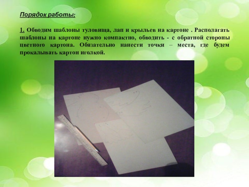 Порядок работы:1. Обводим шаблоны туловища, лап и крыльев на картоне . Располагать шаблоны на картоне нужно компактно,