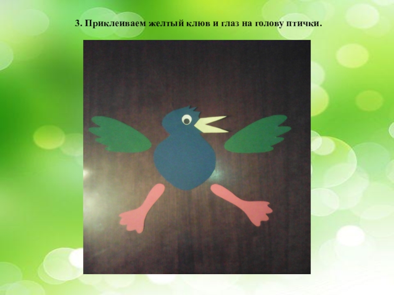 Слайд 83. Приклеиваем желтый клюв и глаз на голову птички.