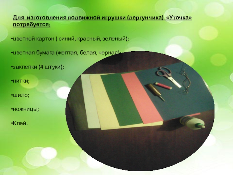 Слайд 5Для изготовления подвижной игрушки (дергунчика) «Уточка» потребуется:
