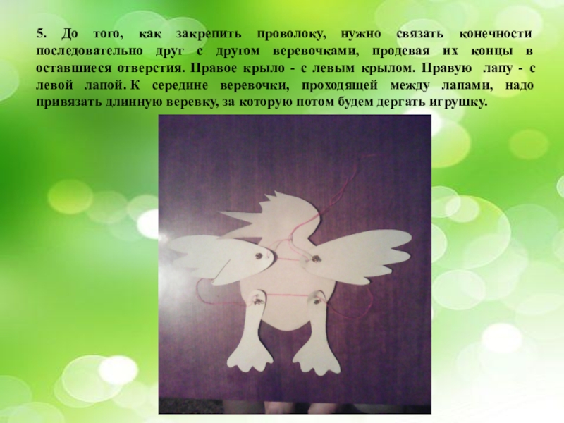 друг с другом веревочками, продевая их концы в оставшиеся отверстия. Правое крыло - с левым крылом. Правую лапу - с левой лапой. К середине веревочки, проходящей между лапами, надо привязать длинную веревку, за которую потом будем дергать игрушку.