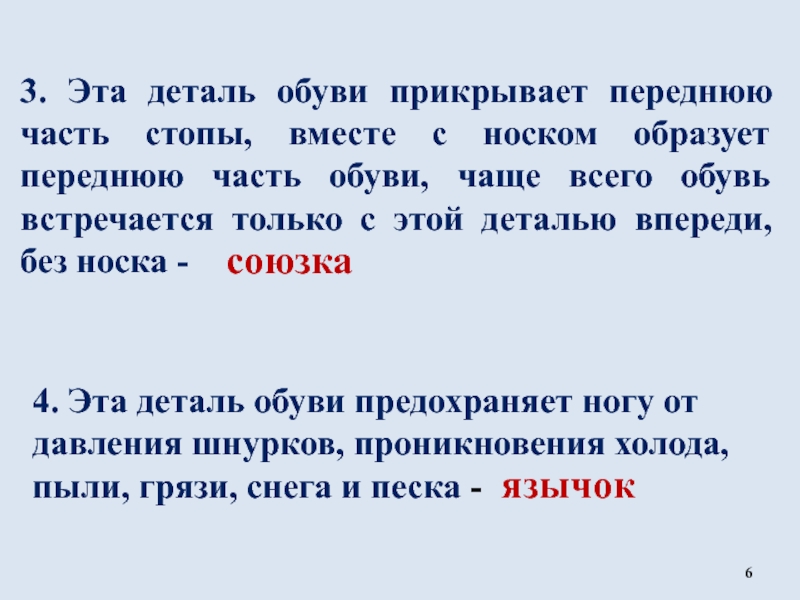4. Эта деталь обуви предохраняет ногу от давления шнурков, проникновения холода, пыли, грязи, снега и песка -