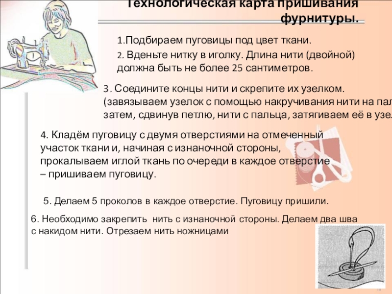 4. Кладём пуговицу с двумя отверстиями на отмеченный участок ткани и, начиная с изнаночной стороны, прокалываем иглой ткань по очереди в каждое отверстие – пришиваем пуговицу.