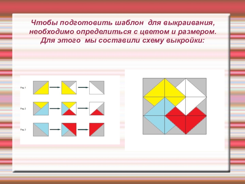 Слайд 15Чтобы подготовить шаблон для выкраивания, необходимо определиться с цветом и размером.