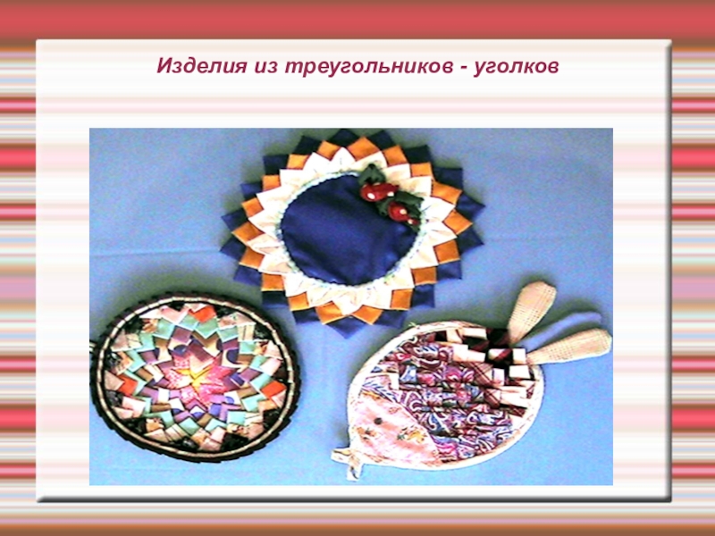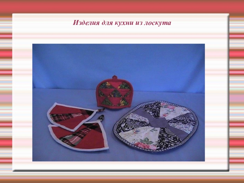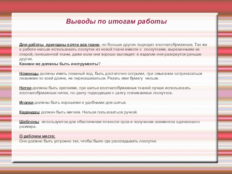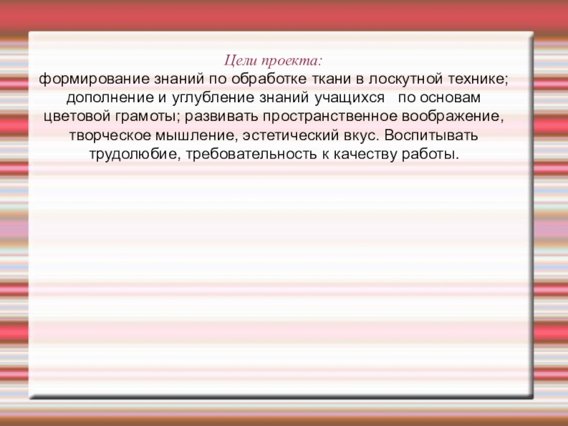 в лоскутной технике; дополнение и углубление знаний учащихся по основам цветовой грамоты; развивать пространственное воображение, творческое мышление, эстетический вкус. Воспитывать трудолюбие, требовательность к качеству работы.
