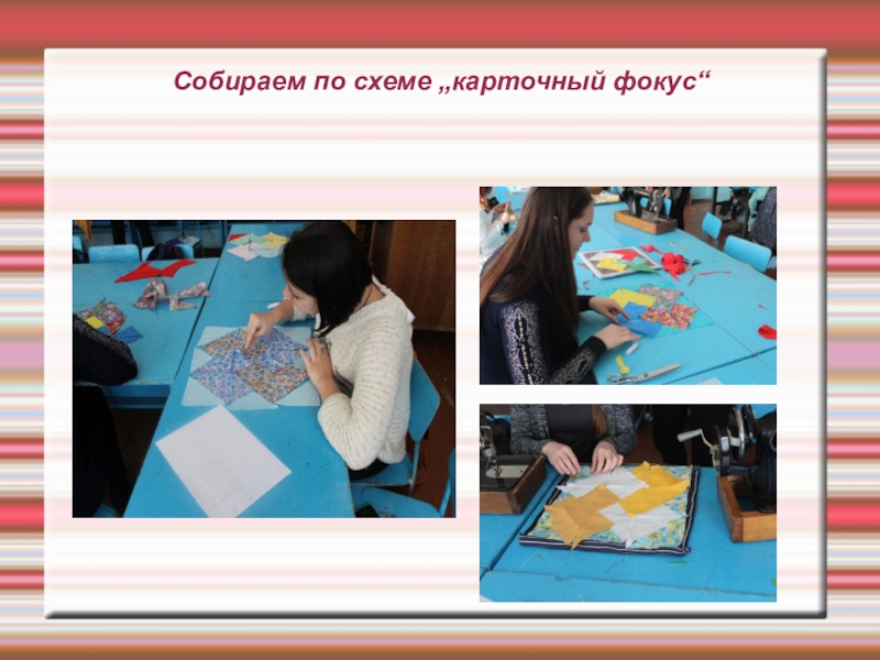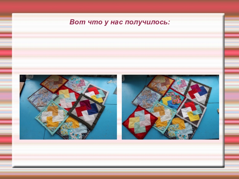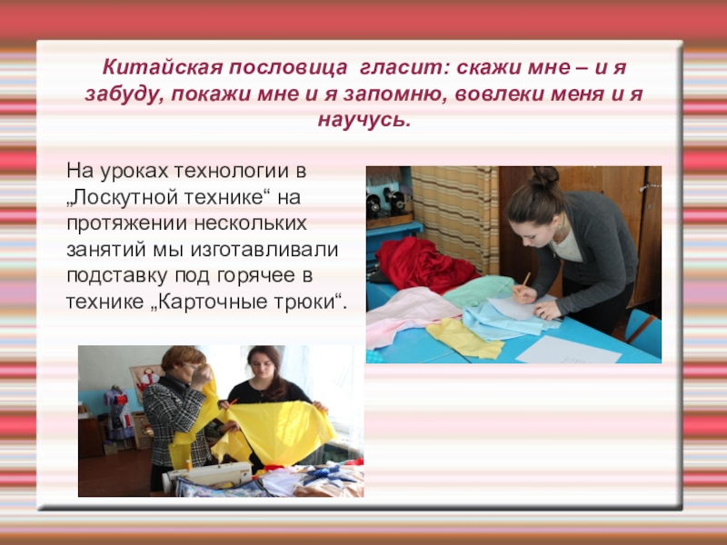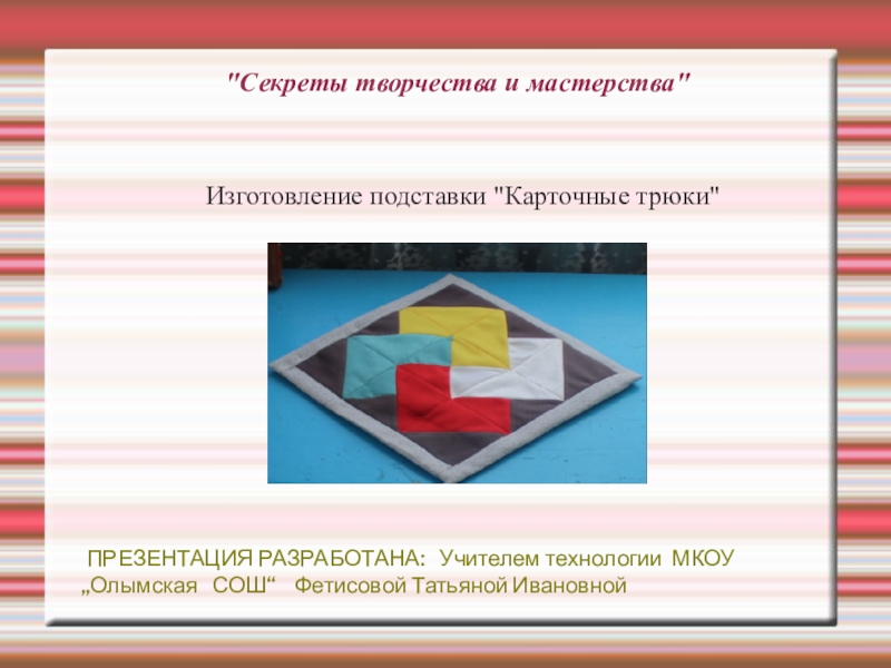 На уроках технологии в „Лоскутной технике“ на протяжении нескольких занятий мы изготавливали подставку под горячее в технике „Карточные трюки“.