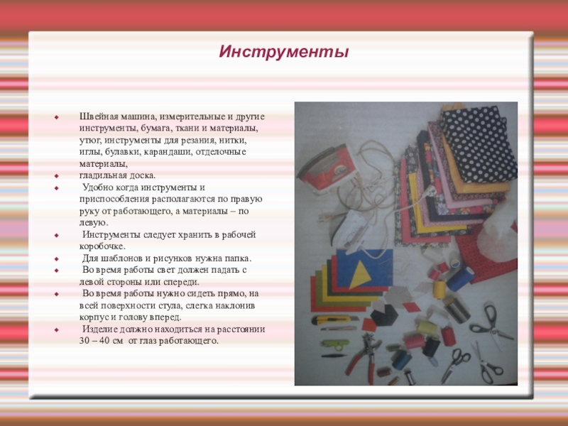 Швейная машина, измерительные и другие инструменты, бумага, ткани и материалы, утюг,
