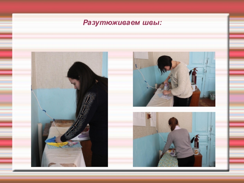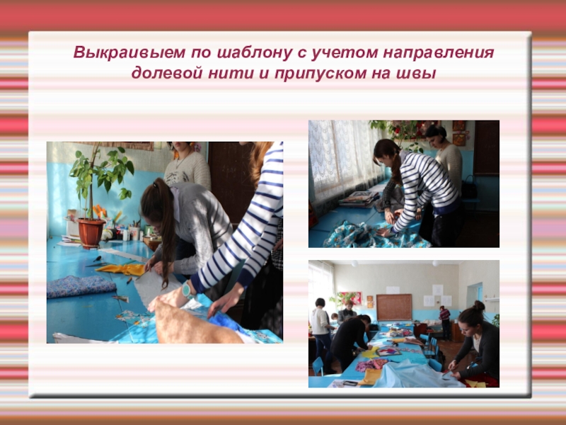 Слайд 18Выкраивыем по шаблону с учетом направления долевой нити и припуском на