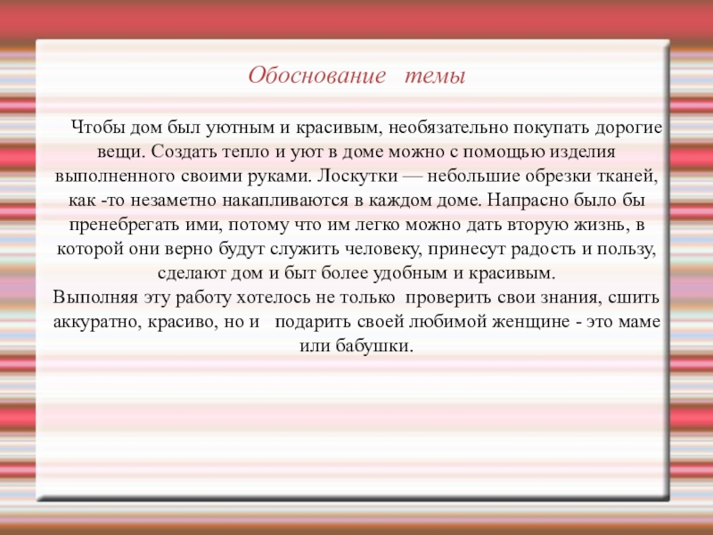 Выполняя эту работу хотелось не только проверить свои знания, сшить аккуратно, красиво, но и подарить своей любимой женщине - это маме или бабушки.