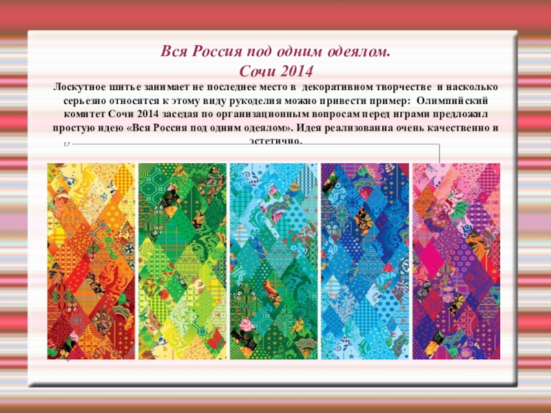 в декоративном творчестве и насколько серьезно относятся к этому виду рукоделия можно привести пример: Олимпийский комитет Сочи 2014 заседая по организационным вопросам перед играми предложил простую идею «Вся Россия под одним одеялом». Идея реализованна очень качественно и эстетично.