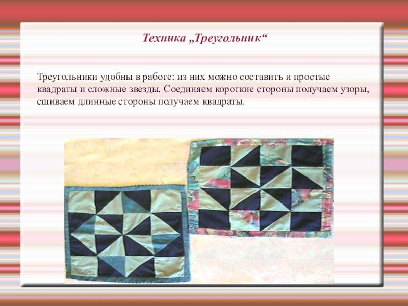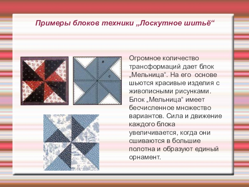 Слайд 7Примеры блоков техники „Лоскутное шитьё“