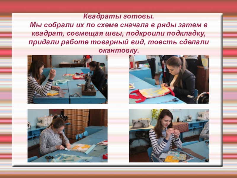 квадрат, совмещая швы, подкроили подкладку, придали работе товарный вид, тоесть сделали окантовку.